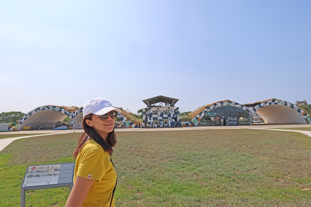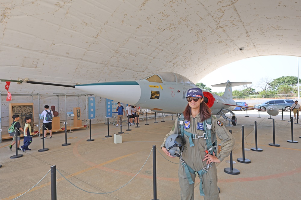 ▲安妮選擇穿著飛官執行戰備任務的綠色飛行衣,背上降落傘包、戴上飛行頭盔,在航空城博物館園區05警戒區內拍攝帥照。