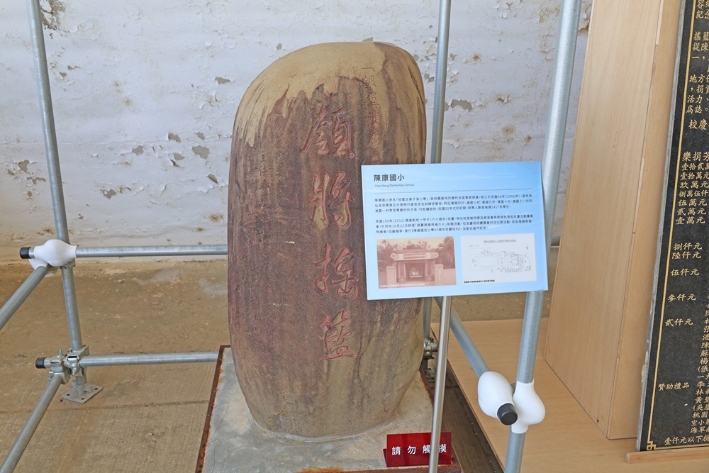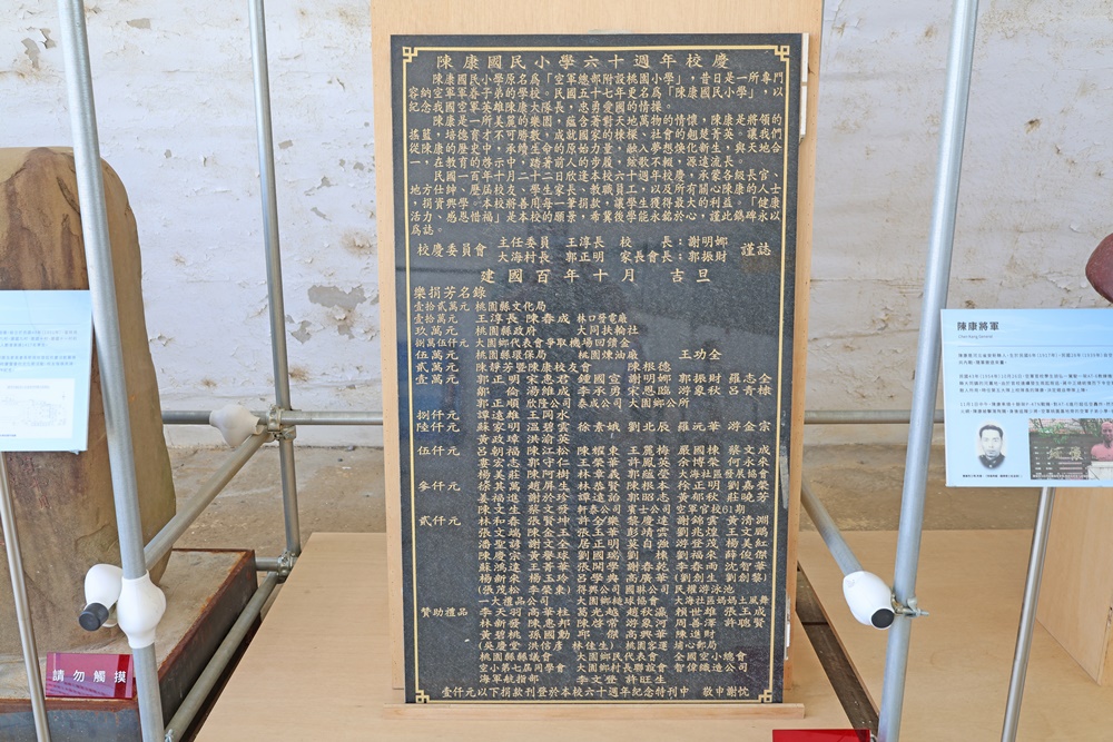 ▲陳康國小原名「桃園空軍子弟小學」,與桃園眷村社區有著緊密的連結。逢創校60週年之際,特別製作這塊勒石留作紀念,象徵校園歷史與社區情感的延續。
