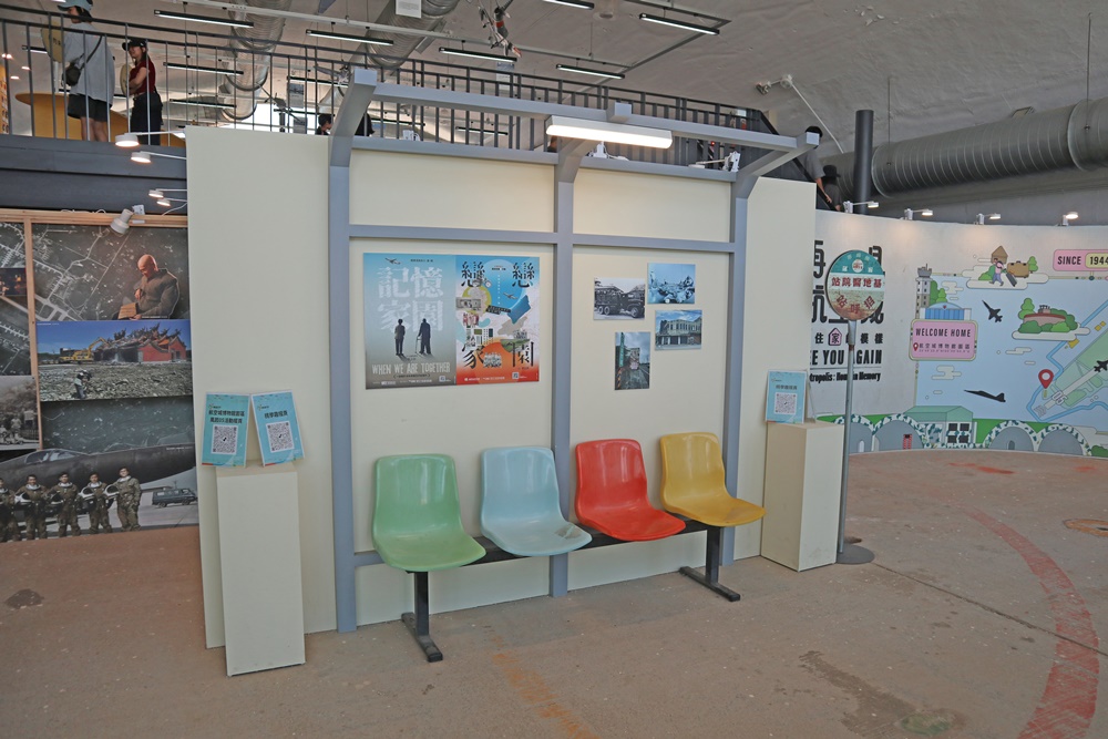 ▲逛完「記憶飛行器:航空城歷史影像行動展」後,我們可以在「基地醫院站」的招呼站涼亭內稍作休憩,坐在椅子上放鬆片刻,接著再前往參觀常設展「再•見航空城:記住家的模樣」。