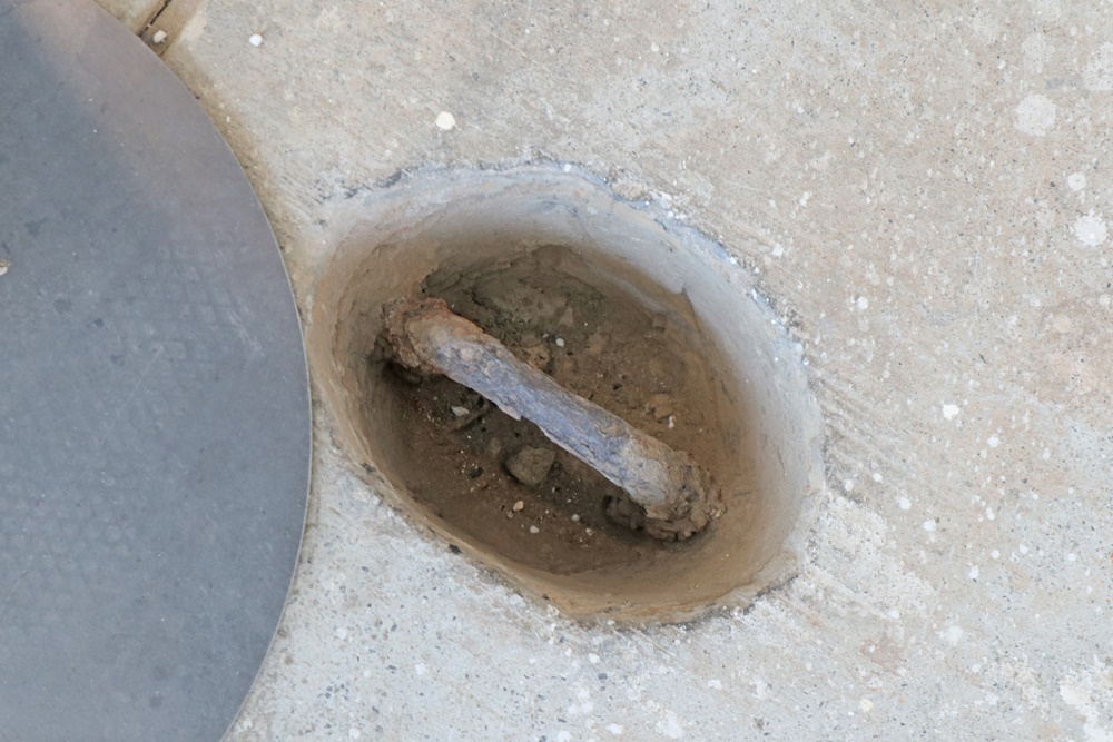 ▲而在桃園市客運「基地醫院站」站牌下方,還保留了古蹟修復時留下的「索機樁」這些可是用來固定飛機、防止被風吹跑的呢!