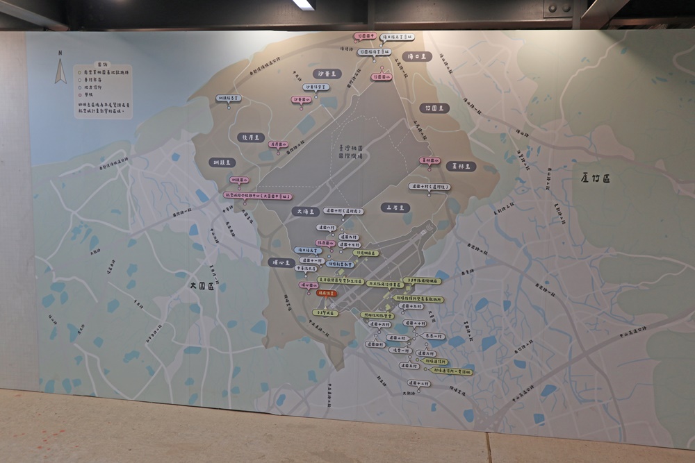 ▲看到地圖上的咖啡色區域,那就是受航空城計畫影響的區域。地圖上還詳細標示了不同圖例,用顏色就能一眼看出各個類別,包括前空軍桃園基地的設施群、眷村聚落、地方信仰,以及學校分布,幫助大家更清楚了解這片土地的歷史與發展。