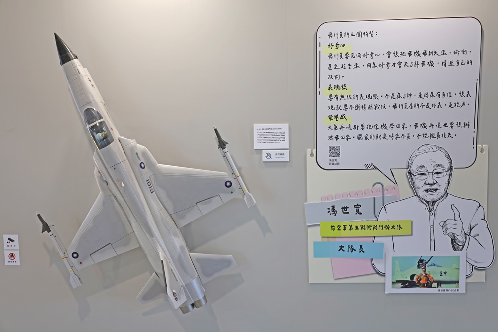▲前國防部長、空軍第五戰術戰鬥機大隊長馮世寬曾提到,飛行員需要具備三個特質:好奇心、表現慾和榮耀感。展板上還設有 QR Code,掃描後就可以觀看馮部長的影音訪談,更深入了解他的經驗與想法。