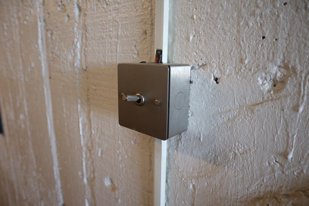 ▲戰火時期,坑道內以蠟燭與油燈照明。經整修後的 W-012 安東二營區,改以工業風撥桿開關控制燈具,開關位置隱藏於牆面,保留復古又實用的設計。