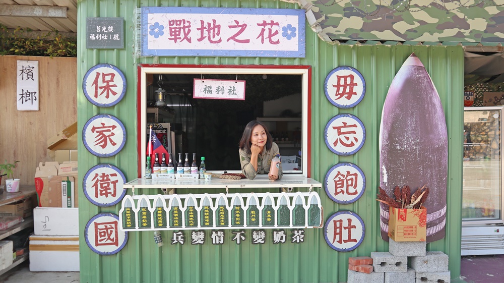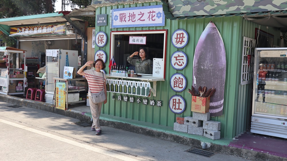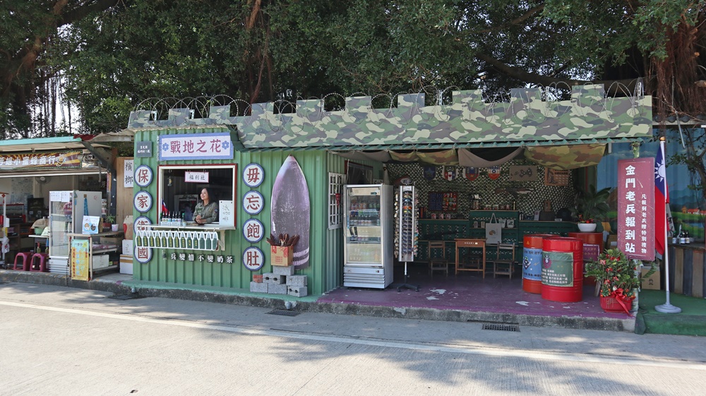 在莒光樓對面,有一家充滿戰地風情的「 戰地之花福利社 」,由新住民崔桂芳於2020年創業開設。闆娘身穿軍裝,帥氣又美麗,加上幾分鄧麗君神似,成了店內最亮眼的存在,遊客幾乎都要與她合照留念。小賣部販售各式金門特色伴手禮與美食,親切的闆娘熱情分享金門景點故事,帶著旅客走入慢活的金門步調,感受純樸的人情與濃厚的戰地文化。這裡不只是購物空間,更像是一段可以珍藏的戰地回憶。