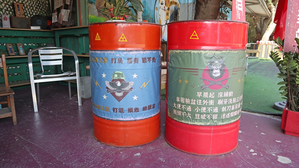 ▲「 戰地之花福利社 」休憩空間內擺放著兩個紅色鐵桶,上面寫著趣味十足的標語,勾起許多老兵的當兵回憶。左邊鐵桶(藍色)寫著:「菜鳥有三寶:打鳥、搭賽、睡不飽;老鳥有三寶:打混、摸魚、牆頭草。」右邊鐵桶(綠色)則寫著:「早晨起,床鋪動,拿著臉盆往外衝,刷牙洗臉三分鐘;大便不通,小便不通,刺刀拿來通一通;饅頭不大,豆漿不甜,迷迷糊糊過兩年。」每一行文字都像在述說軍中生活的趣味與辛苦,也讓人會心一笑。