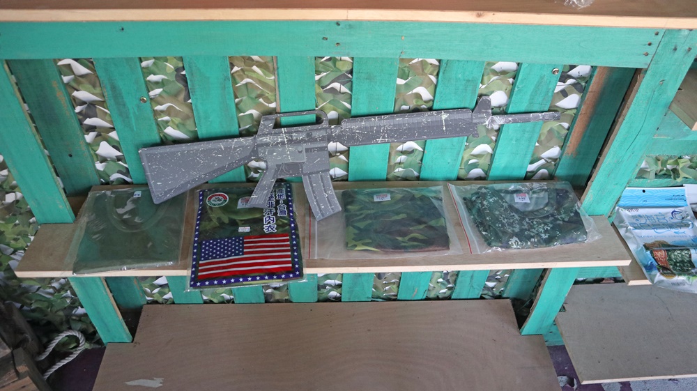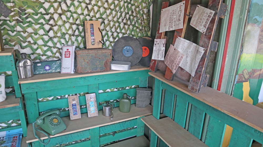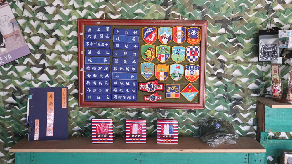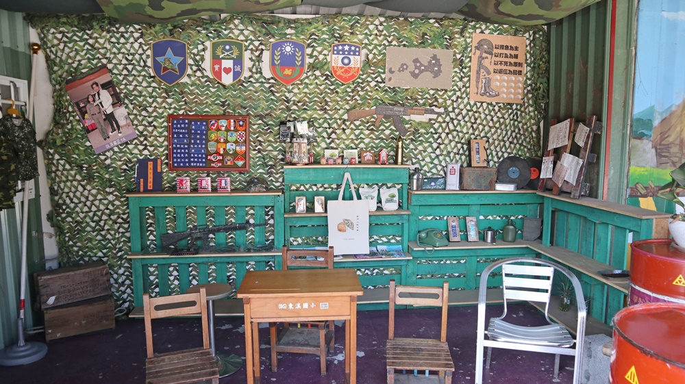 ▲充滿濃厚戰地風情的「 戰地之花福利社 」,提供旅客休憩的空間,布置了各式彈藥箱、臂章、帆布袋、一條根及軍事文創商品等。旅客在此歇腳的同時,也能挑選到喜愛的軍事文創紀念品,享受獨特的金門戰地氛圍。