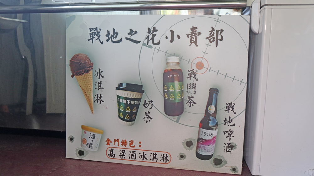 ▲「 戰地之花福利社 」融合金門在地特色,販售冰淇淋、高粱酒冰淇淋、戰鬥茶、兵變情不變奶茶,以及金門戰地啤酒。每一款商品都充滿在地風味,讓人品嘗到金門獨特的戰地魅力。