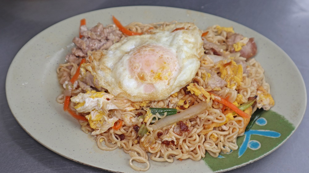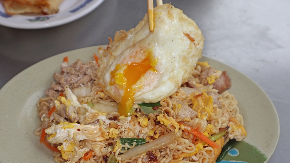 ▲安妮的隱藏版吃法:單點一顆荷包蛋!下單時記得提醒老闆娘「蛋黃不要太熟」,並請她把荷包蛋放在炒泡麵上。上桌後輕輕戳破蛋黃,讓金黃色的蛋液緩緩流出,與炒泡麵拌在一起每一口都滑順濃郁、超級療癒!★★★很重要~泡麵跟蛋黃一定要快速攪拌